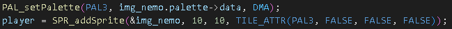 player = SPR_addSprite(&img_nemo, 10, 10, TILE_ATTR(PAL3, FALSE, FALSE, FALSE));
