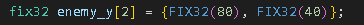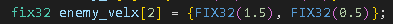fix32 enemy_x; and fix32 enemy_y. We’ll also add a fix32_velx that we’ll use later