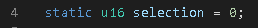 Next, we’re going to add a variable called selection and assign it a u16 value. We have four games so we’re going to select 1 through 4 or 0 through 3 if we’re iterating through an array. The four choices will correspond to the switch statement back in main.c
